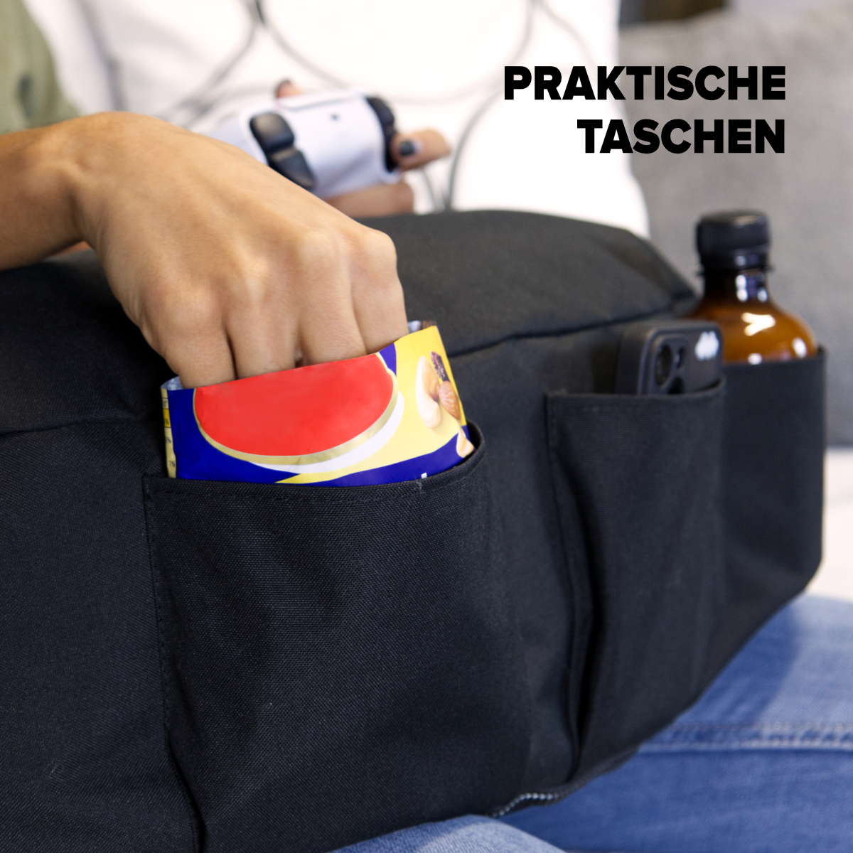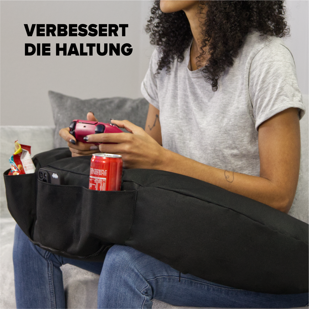 Chez Gamewarez, nous avons développé le nouveau Gamerpad pour les amateurs de consoles et les joueurs portables. En plus des graphismes et du plaisir, à notre avis, une chose est la plus importante lorsqu'on joue : le confort. Notre nouvel oreiller de jeu est spécialement conçu pour prévenir le « Gamers Lean » en favorisant une meilleure posture tout en soulageant la pression sur le dos, le cou, les épaules et les bras. Les poches latérales offrent également suffisamment d'espace de rangement pour tout ce dont un joueur a besoin pour profiter pleinement du jeu : du téléphone portable à la télécommande en passant par une boisson gazeuse.